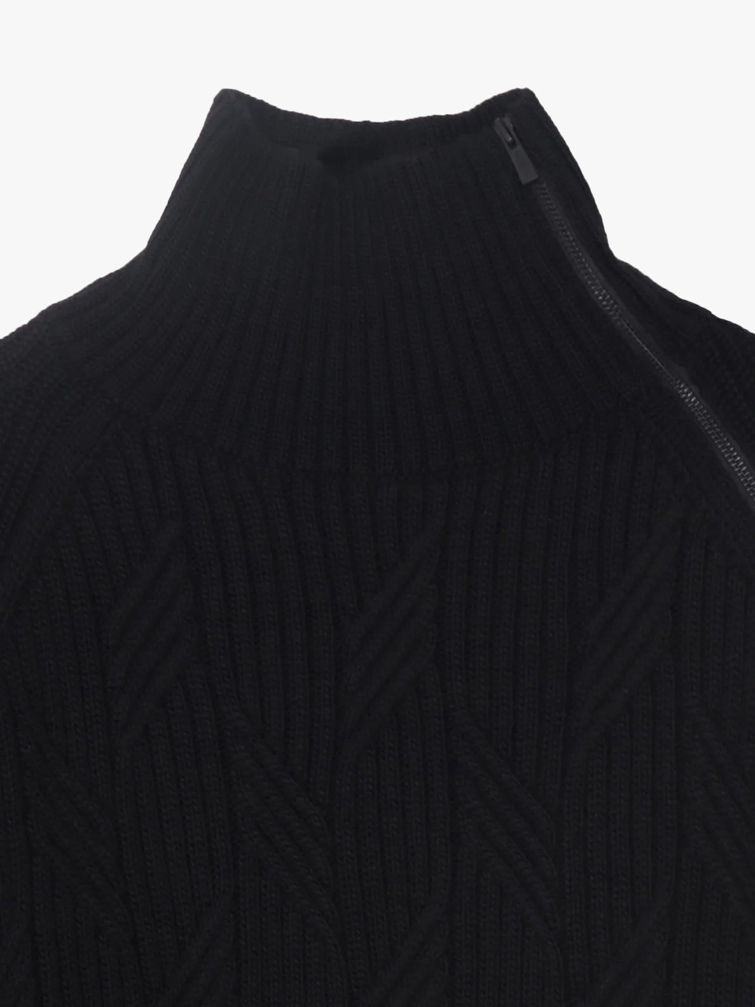 This high-neck knit sweater incorporates a zipper design and is crafted from 100% wool. The yarn enhances the fabric's natural feel, providing a voluminous yet lightweight knit. It boasts excellent warmth retention, a plush appearance, and a soft touch offering exceptional comfort.