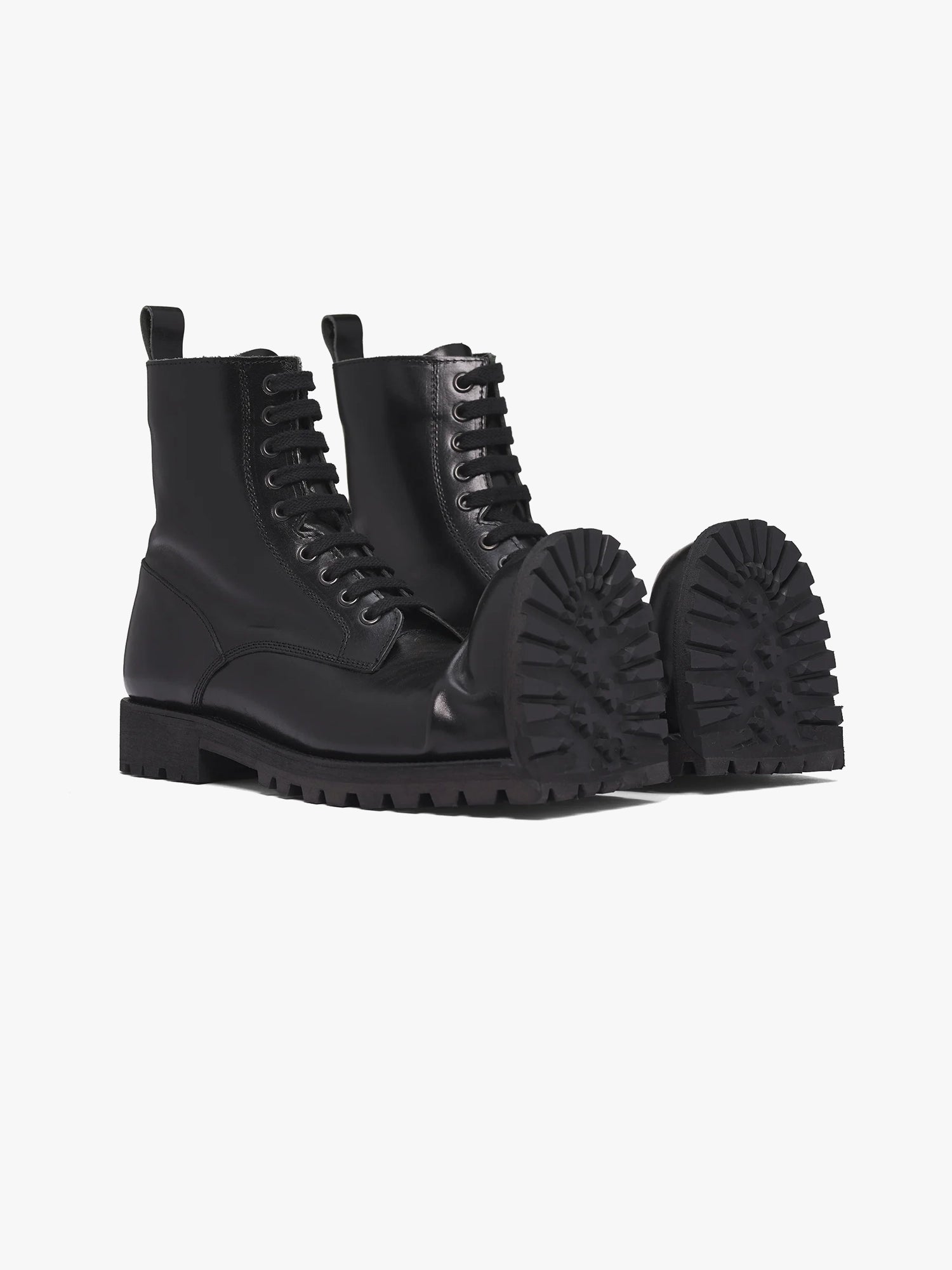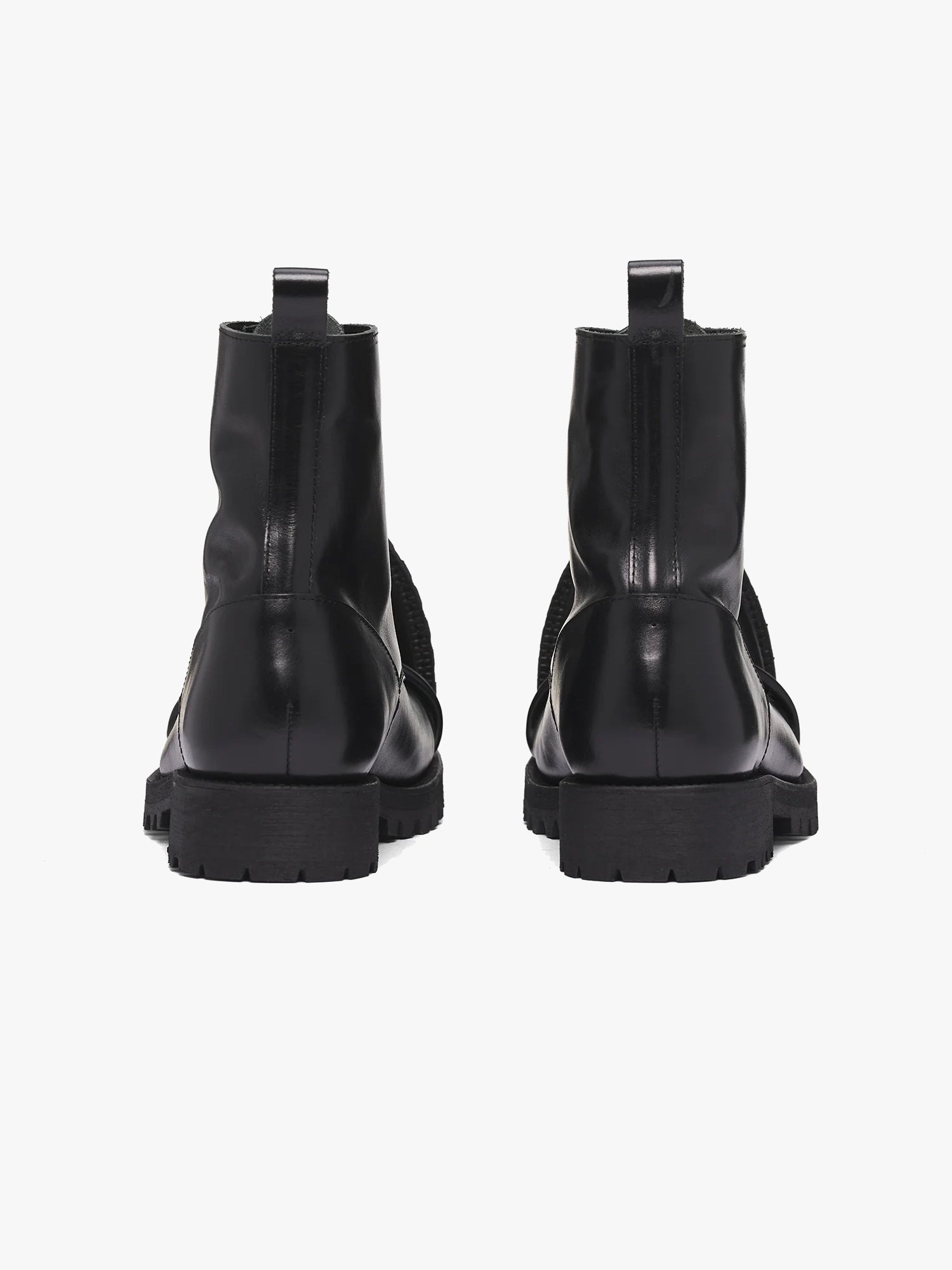 Ankle high cut black leather boots defined by a sculptural crushed toebox that turns upward at a sharp 90-degree angle.