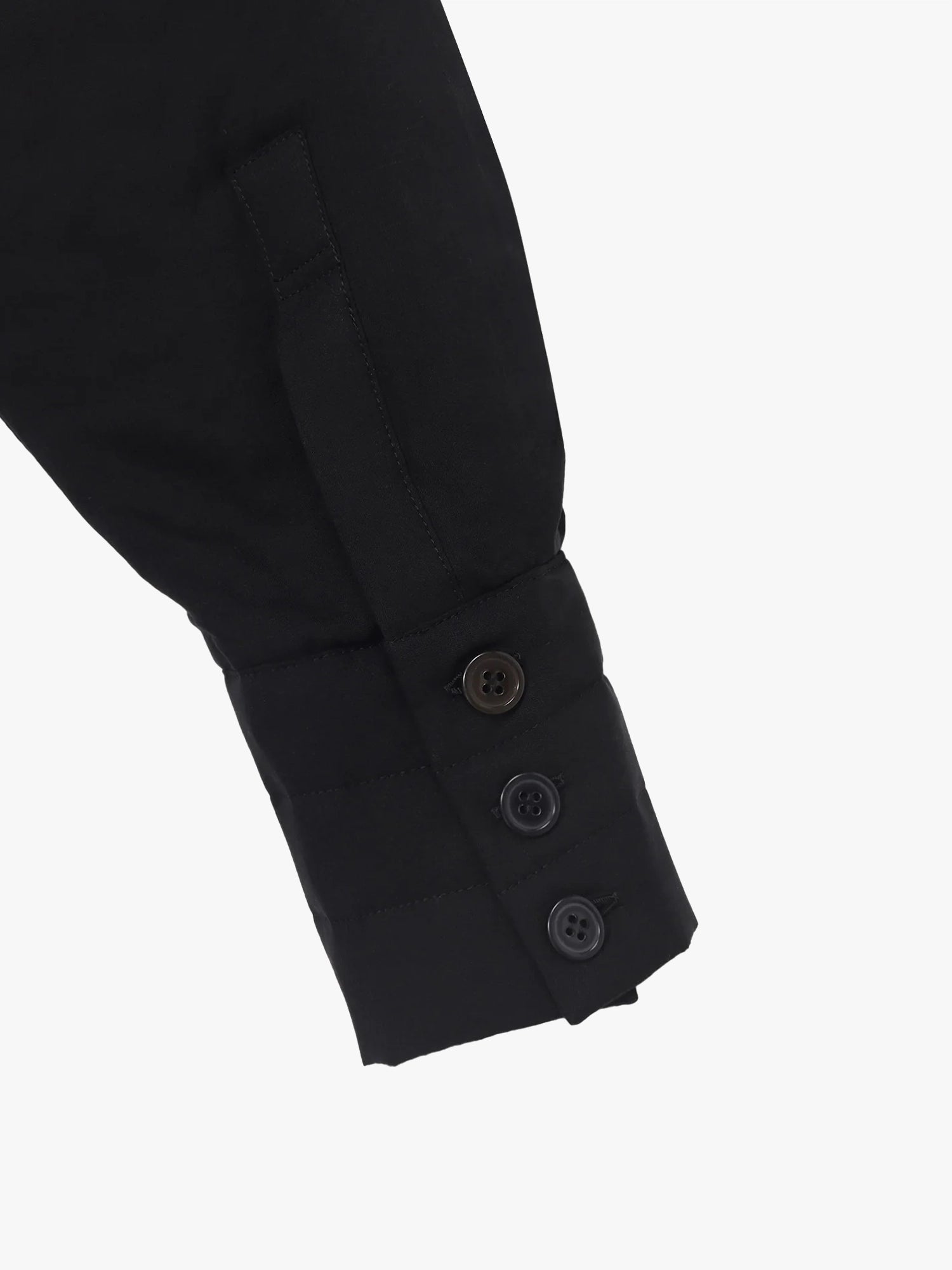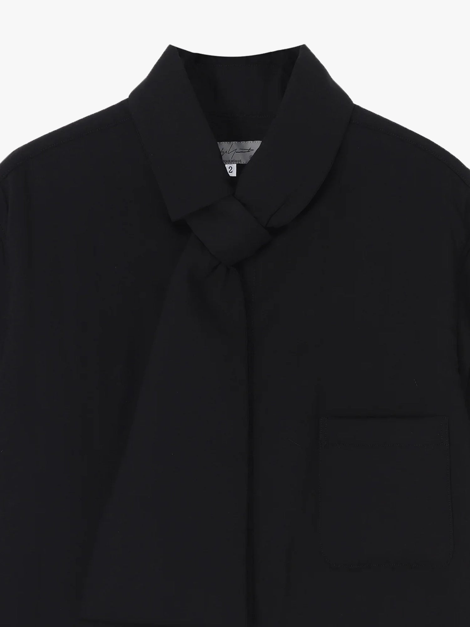 This padded stole blouse from the Yohji Yamamoto POUR HOMME A/W 2025-26 collection, Look 28, stands out for its soft feel and flowing drapery provided by the cellulose yarn. Its design typifies the ethereal yet structured aesthetic that defines the Yohji Yamamoto collections.
