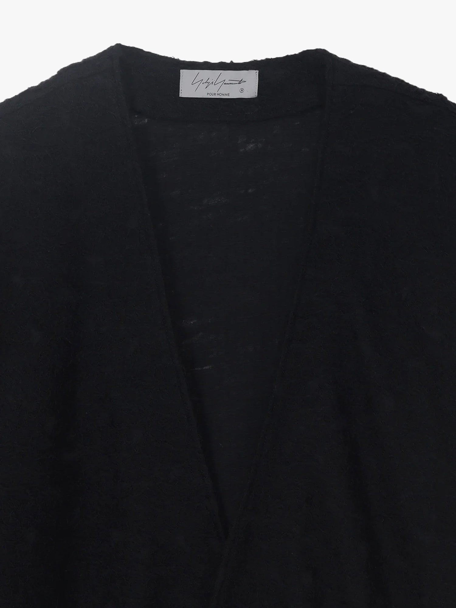 - Features a collarless, long cardigan silhouette.
