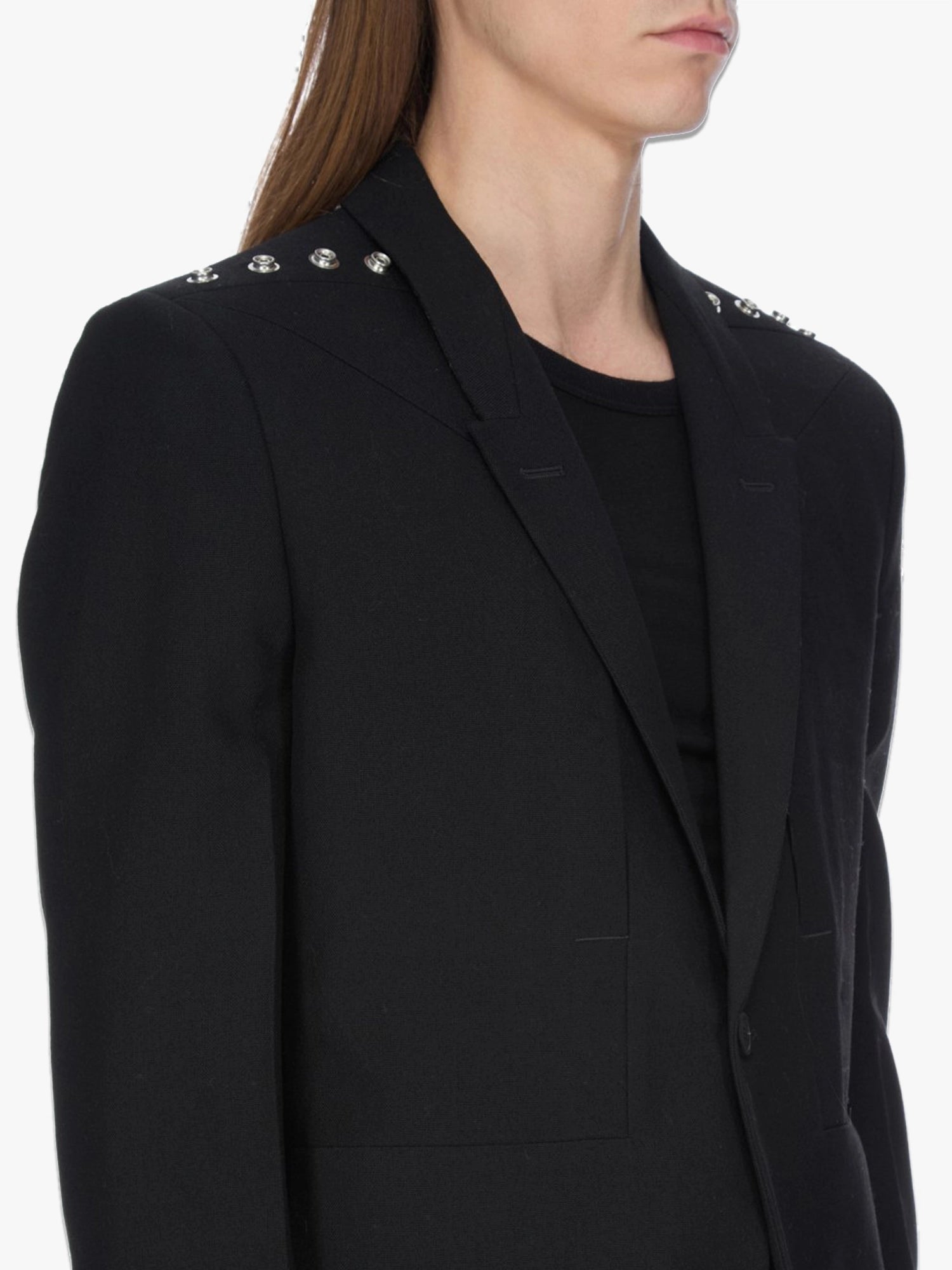 - It has a slim lapel, a single-button front closure, two fog breast pockets with vertical openings and internal snaps, and two side-seam pockets.