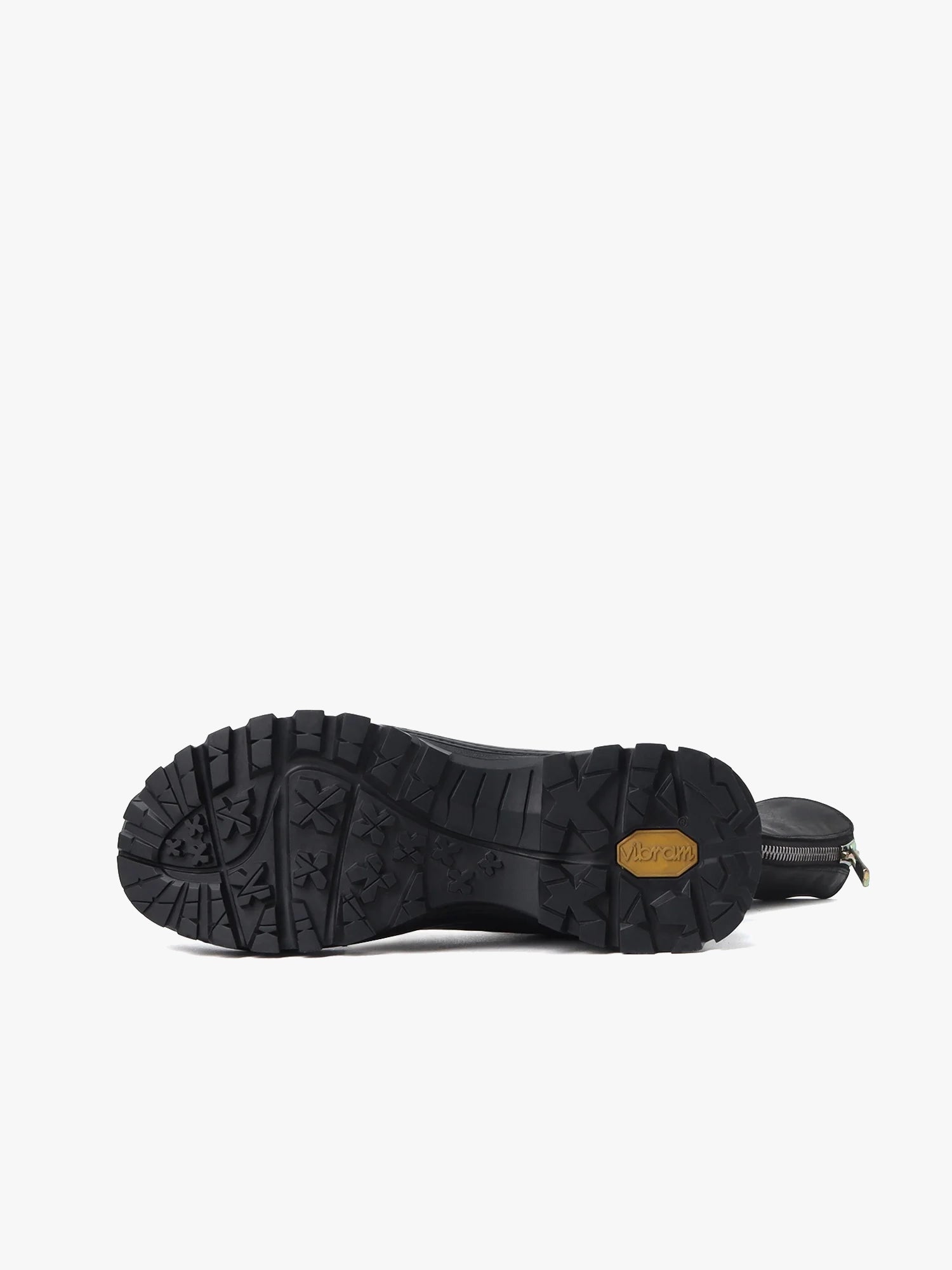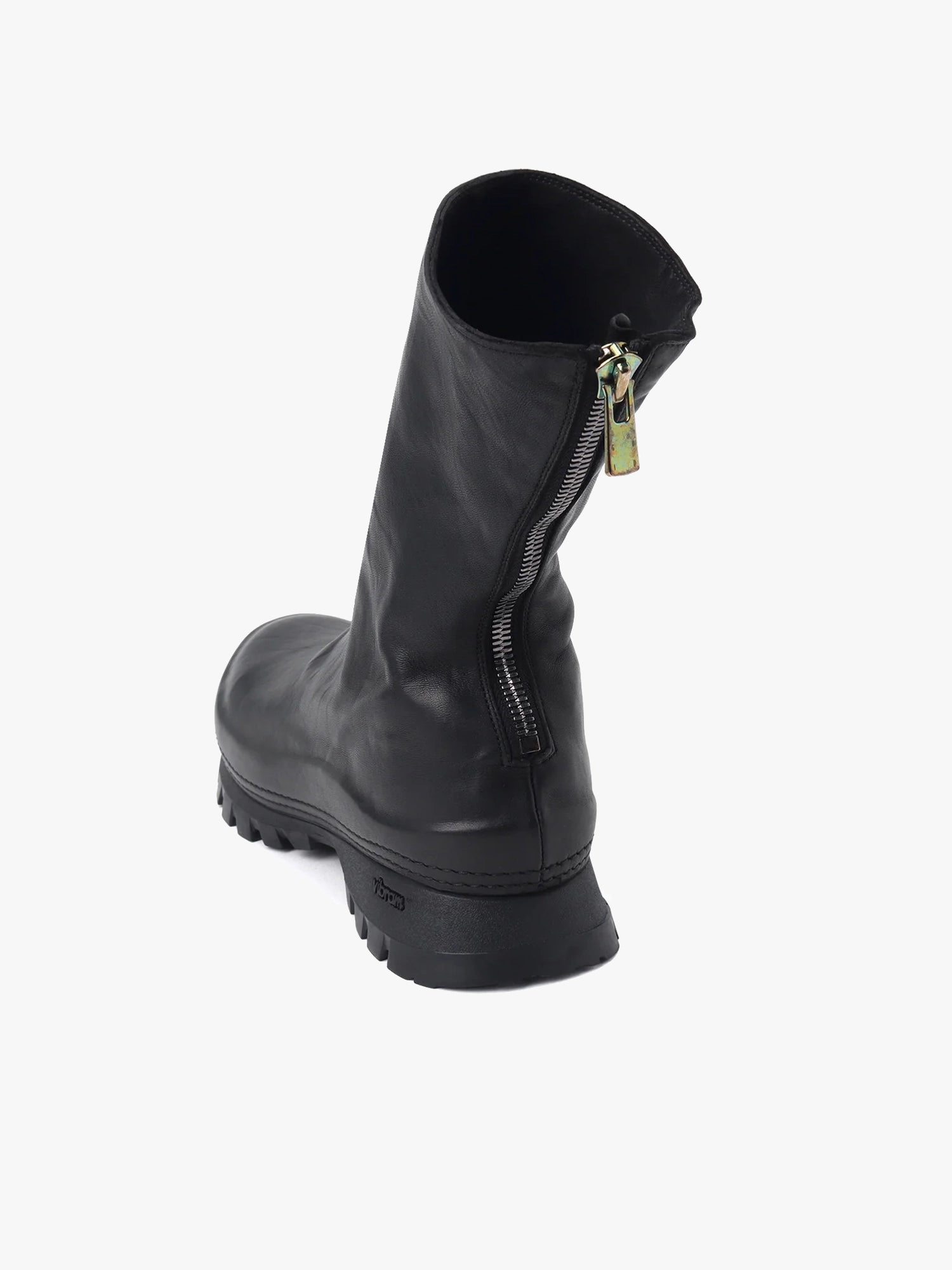 Yohji Yamamoto POUR HOMME's A/W 2025-26 collection features collaboration boots with GUIDI in looks 2, 6, 10, 15, and 17. These boots are crafted from garment dyed horse leather, offering unique individuality in each pair. The soles are made by Vibram.