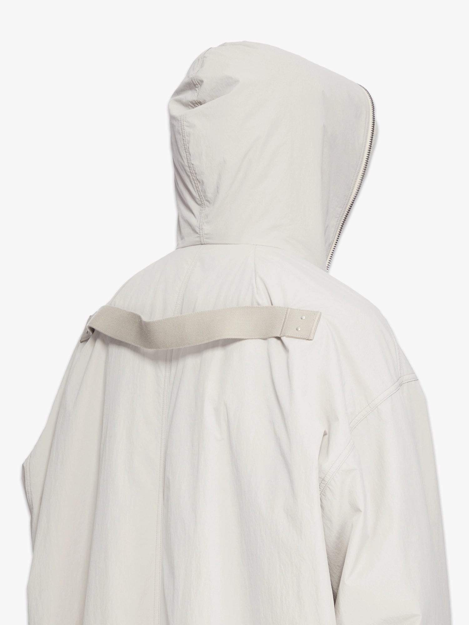- Large hood with level shoulder seams
