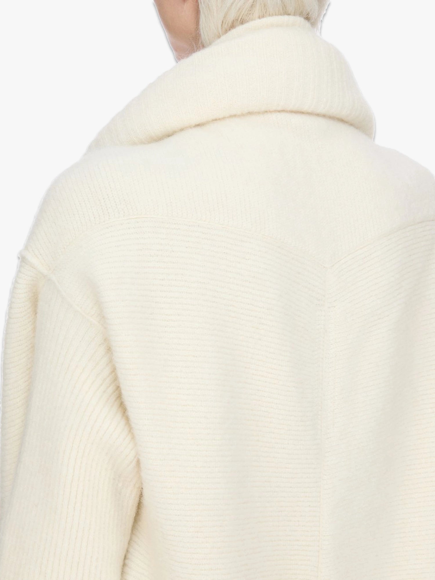 - It includes a broad knit shoulder line, side-front pockets, ribbing that runs from the upper arm to the wrist, and a signature knit channel down the centre-back spine.