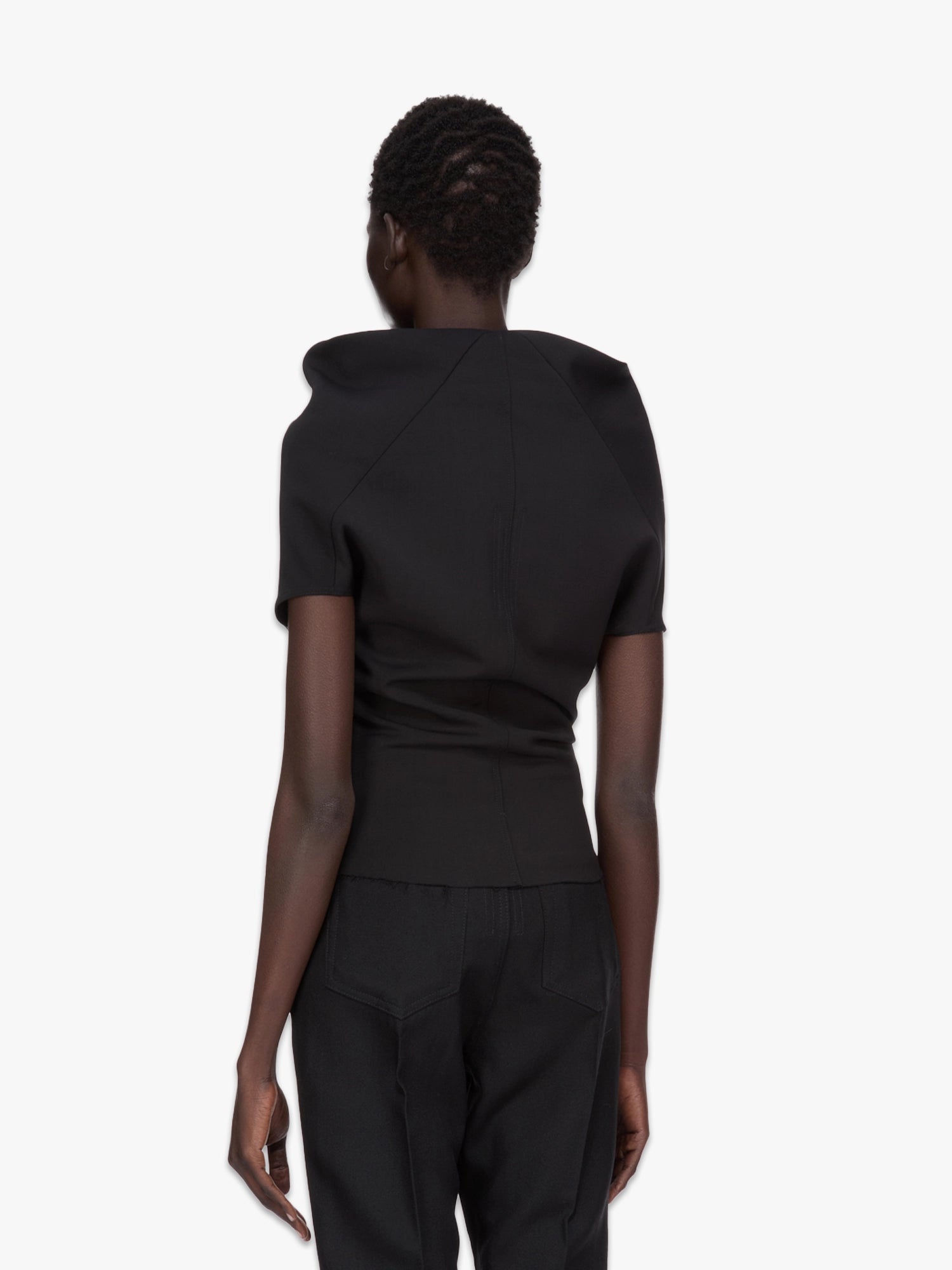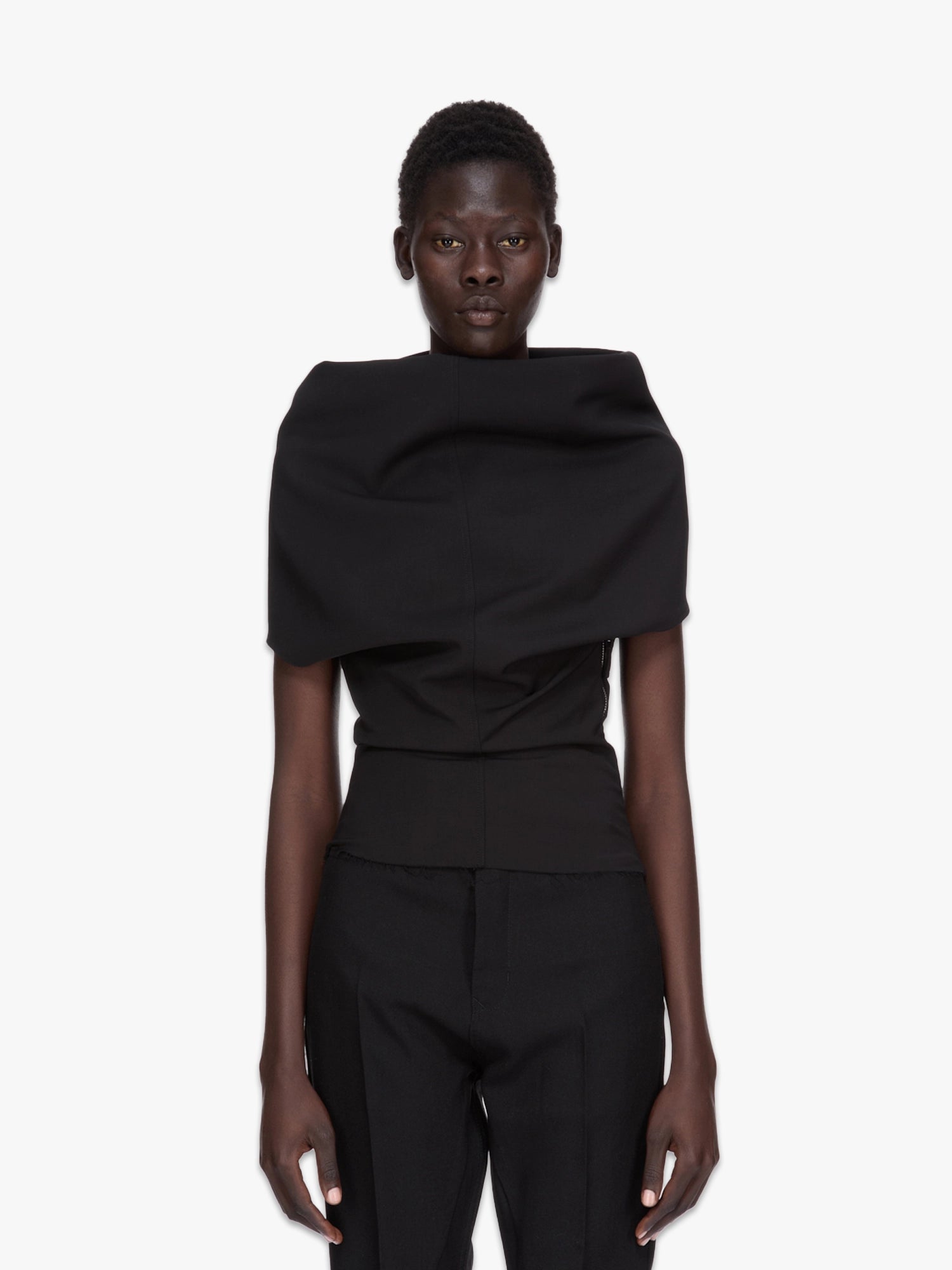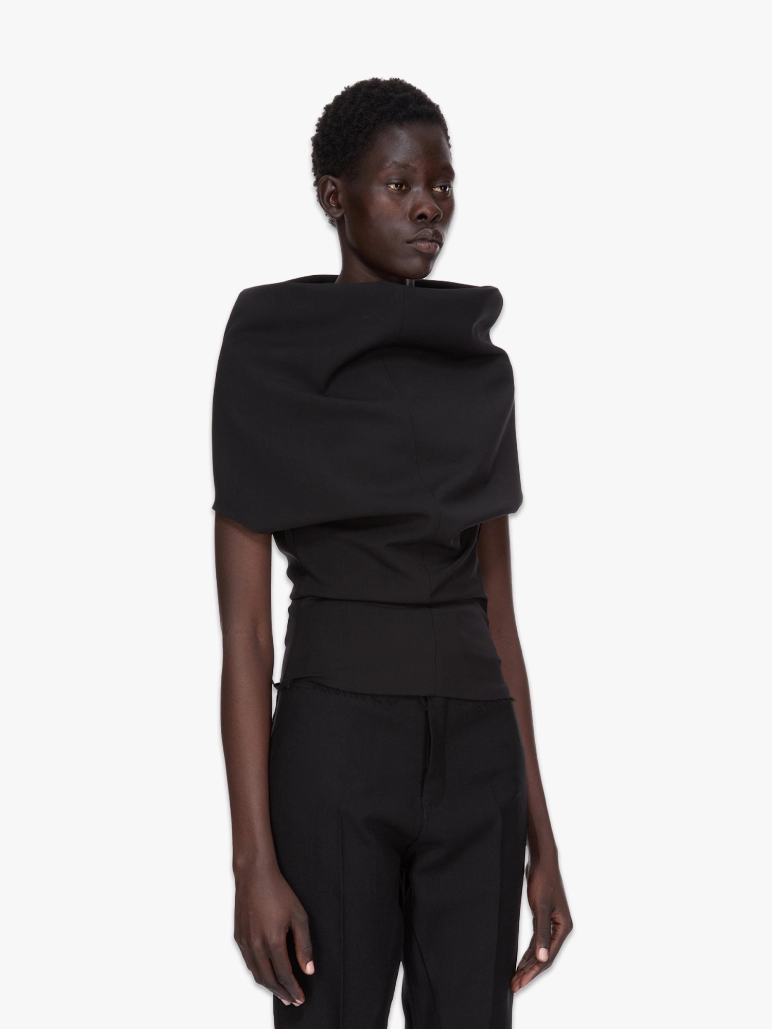 - This shroud sits above the hip and has a draped tubular neck that broadens across the shoulders, forming a short fitted sleeve.