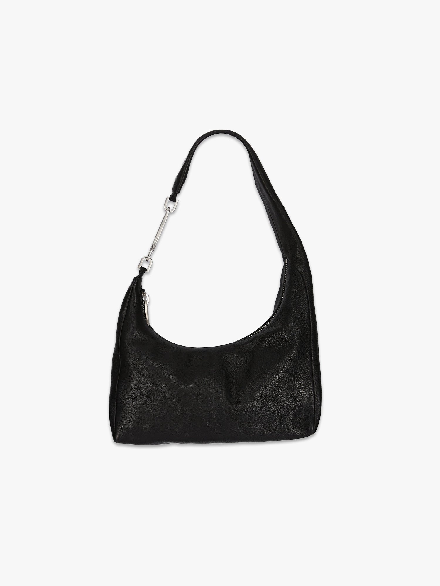 - It curves upward to form a strap secured with a Gemini double-ended snap hook engraved with the Rick Owens logo.