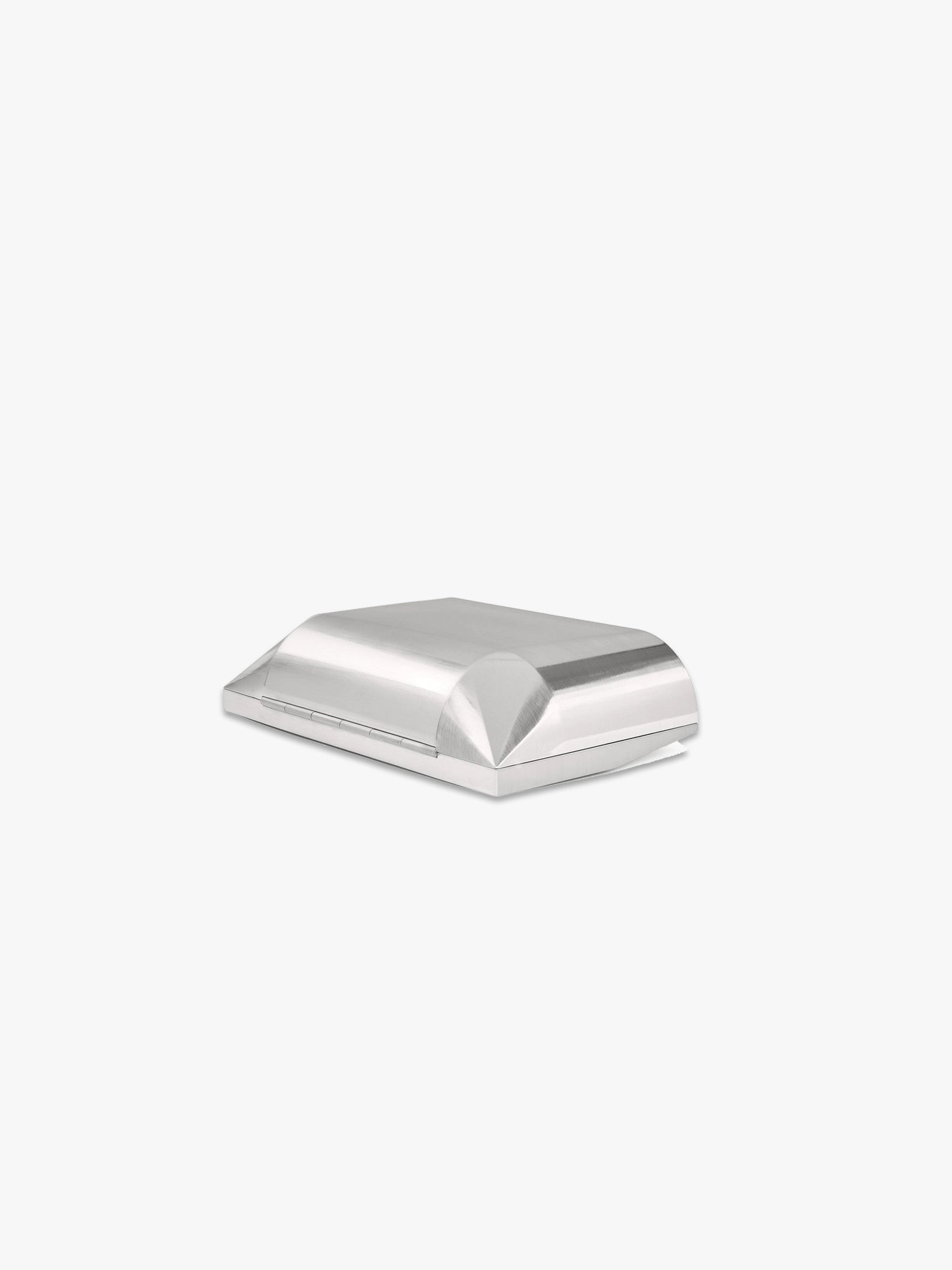 - This small prong clutch is a hard-case metal bag with a flat base, rounded silhouette, and beveled corners.