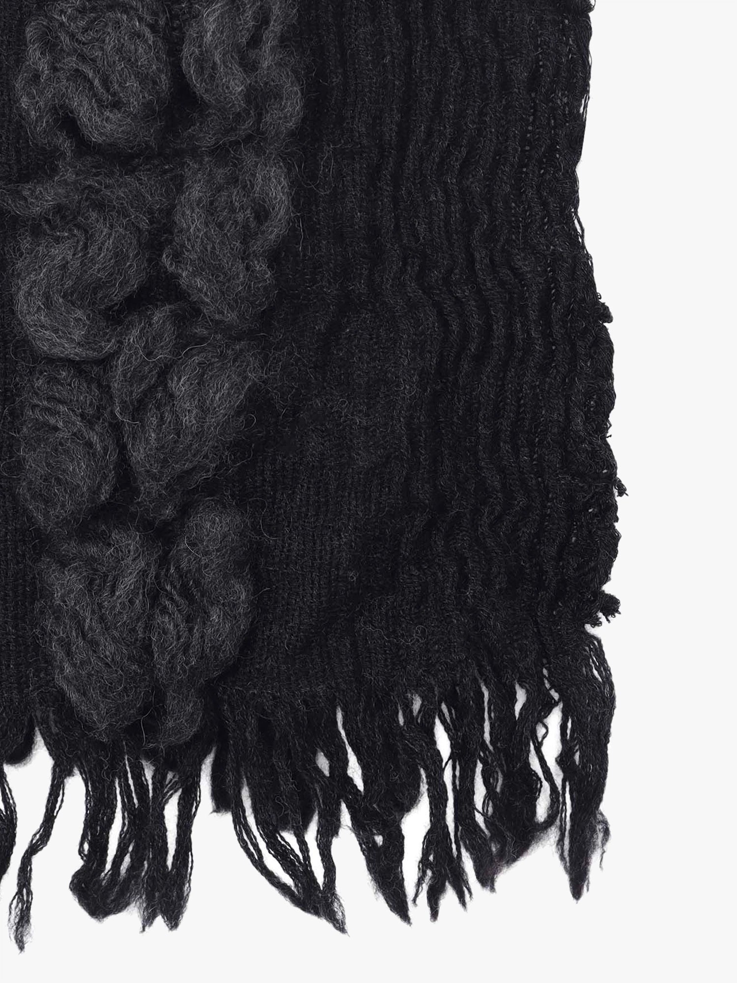 This unique scarf, combining wool yarn with wool slub yarn, features a crepe-like texture and a distinctive design with slub yarn stripes on both sides. The base wool is treated with a crepe finish for added texture.